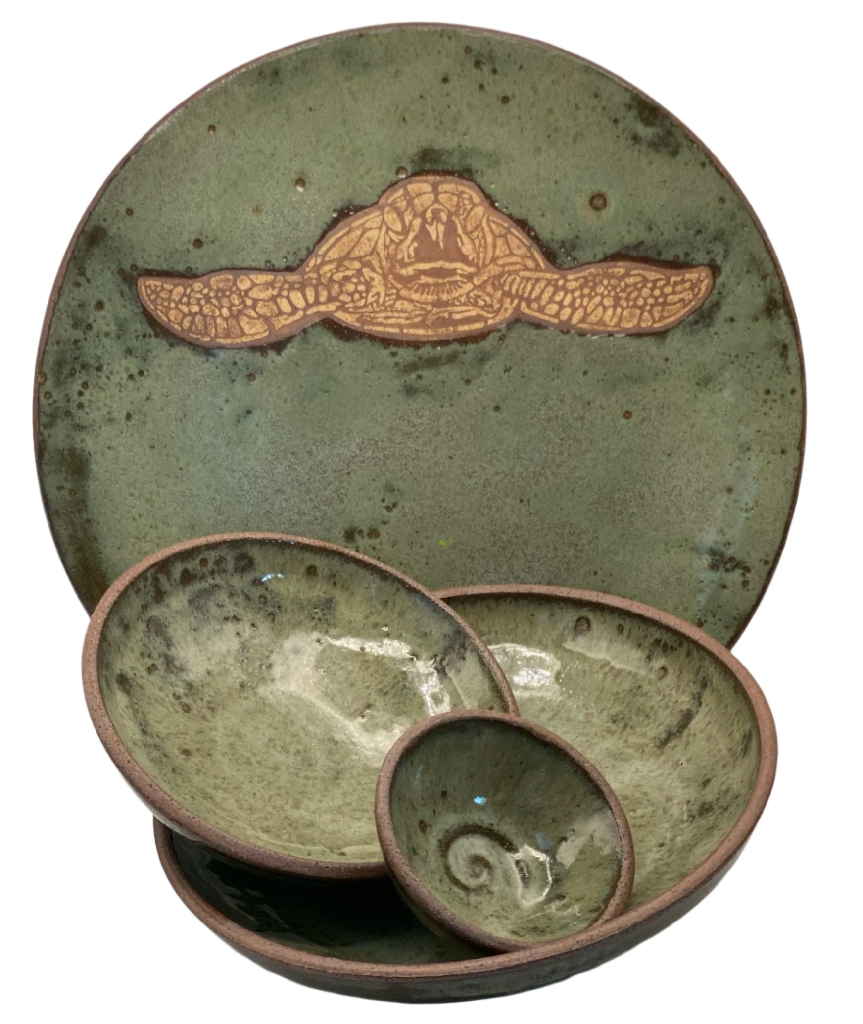 This series is done in a CCS speckled clay to reflex the sand and the glazing is done in greens with spashes of blue as you would find on a turtle's back.