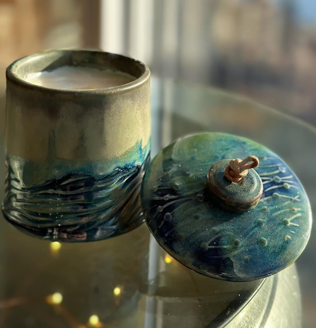 Commissions for similar pieces to "Wandering" - Small ceramic candle with lid are available - contact us at hello@serendipitytrove.com to learn more